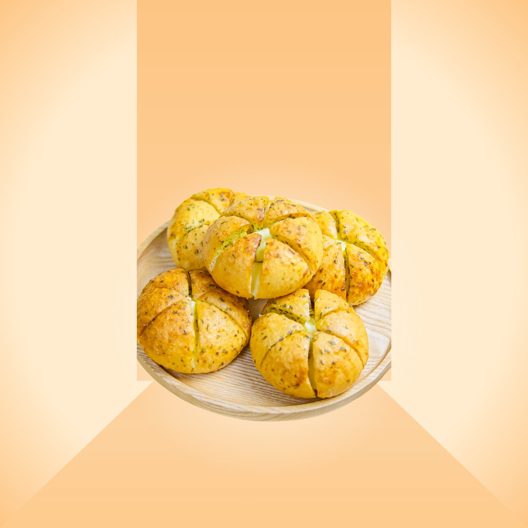 Bánh mì sốt phô mai bơ tỏi có tạo hình tròn xinh, mặt bánh được cắt rãnh đều giúp sốt thấm sâu vào từng thớ bánh. Lớp vỏ ngoài nướng vàng giòn nhẹ, bên trong bánh mềm xốp. Sốt bơ tỏi thơm đậm, hòa quyện cùng phô mai béo mặn, khi nướng chảy nhẹ vào các khe bánh, tạo nên hương vị hấp dẫn khó cưỡng.