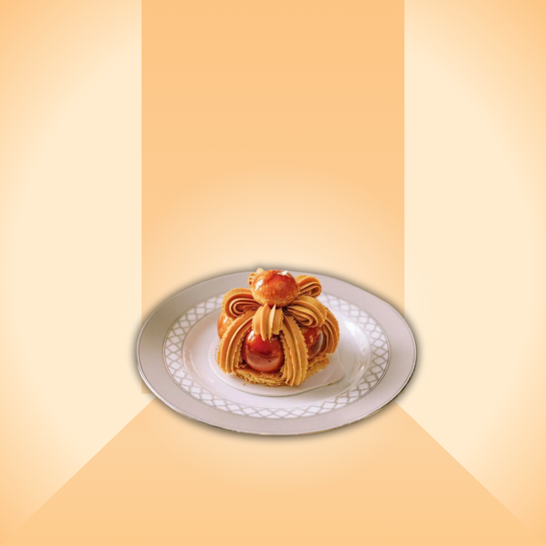 Bánh Saint Honoré được tạo nên từ lớp đế bánh giòn nhẹ, phía trên là kem mịn được bắt hoa văn tinh xảo, kết hợp cùng những viên bánh su nhỏ phủ caramel óng ánh. Phần kem có kết cấu mềm mượt, béo vừa phải, hòa quyện cùng vị ngọt nhẹ của caramel, tạo nên tổng thể hương vị hài hòa và thanh lịch.